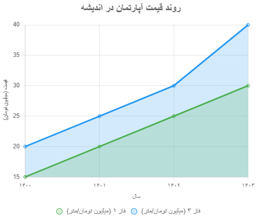 برای درک بهتر پتانسیل سرمایهگذاری، نمودار زیر روند قیمت هر متر مربع آپارتمان در فازهای ۱ و ۳ را از سال ۱۴۰۰ تا ۱۴۰۴ نشان میدهد (دادهها تقریبی و بر اساس اطلاعات بازار هستند):
